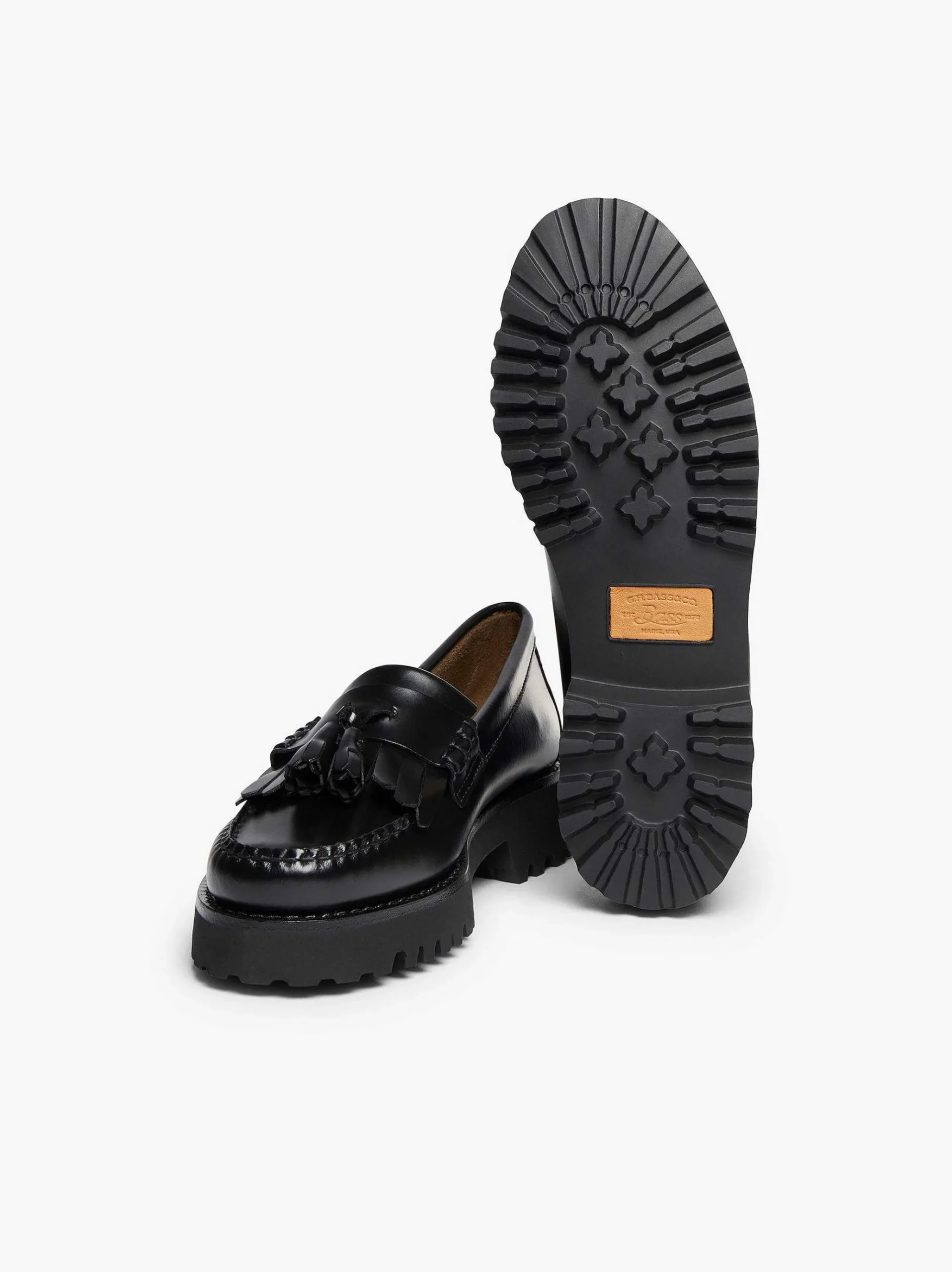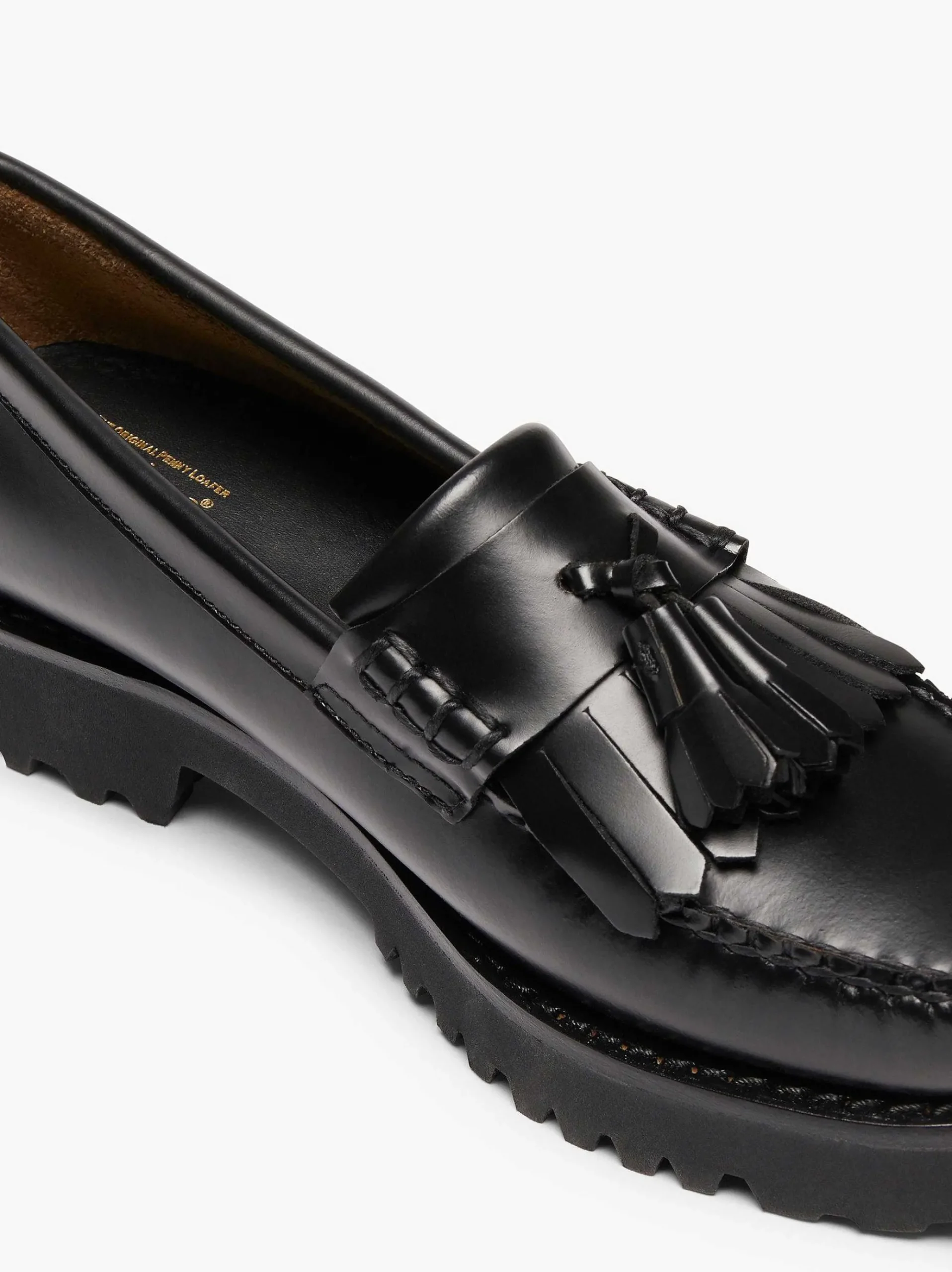 The Iconically Stylish Men’S Esther Kiltie Tassel Loafer Has Been Reworked Onto The Weejuns 90S Profile With A New Flair. Now Finished On The Lightweight Chunky Lug Outsole Adding A Subtle Elevation. Hand-Made In El-Salvador In A Black Polished Leather Upper, Featuring Decorative Front Tassels And Tonal Fringing, This Silhouette Brings A Youthful Twist, Redefining Smart Casual Daywear And Even Dressed Down Days In Boxy Denim.