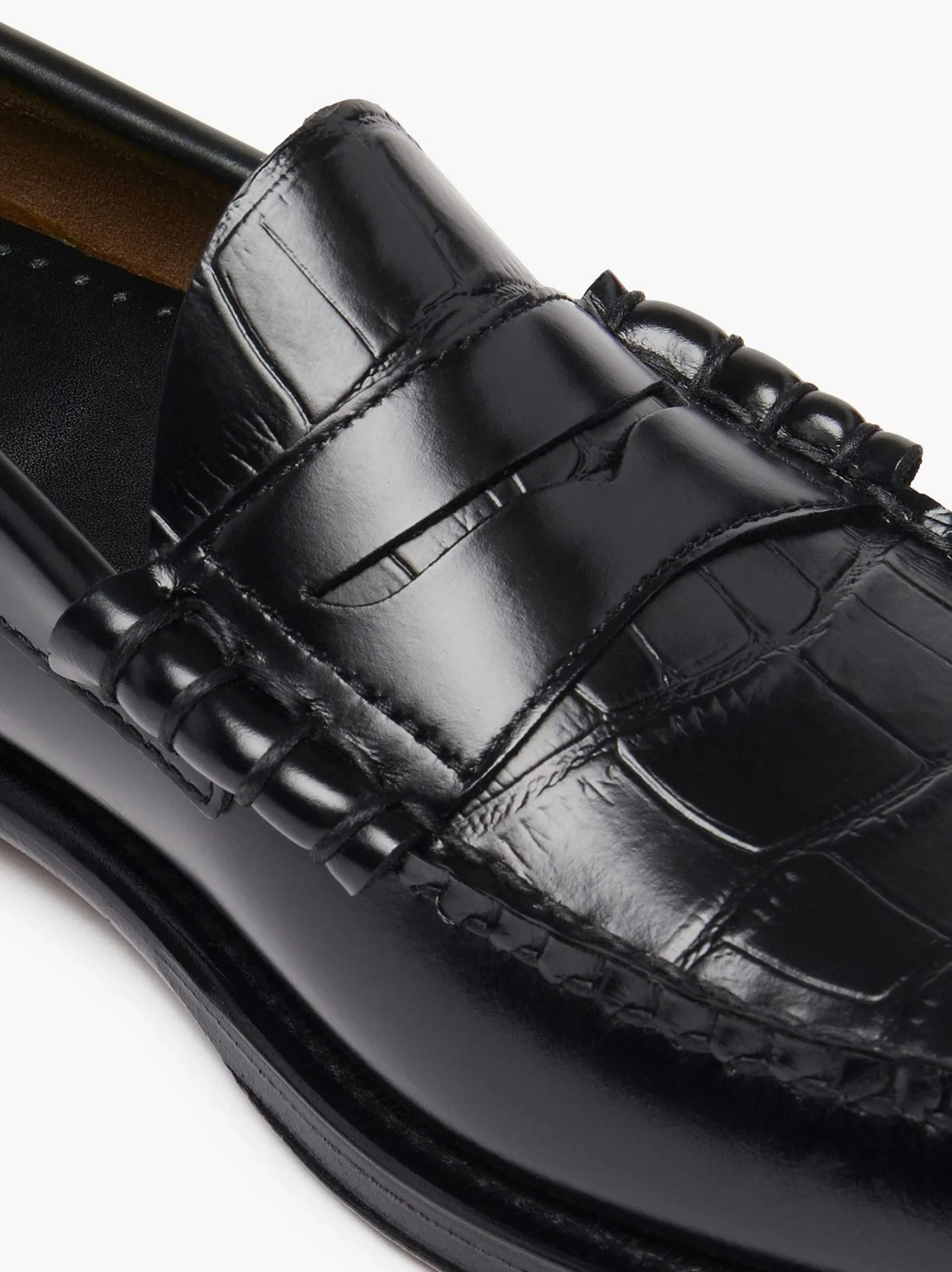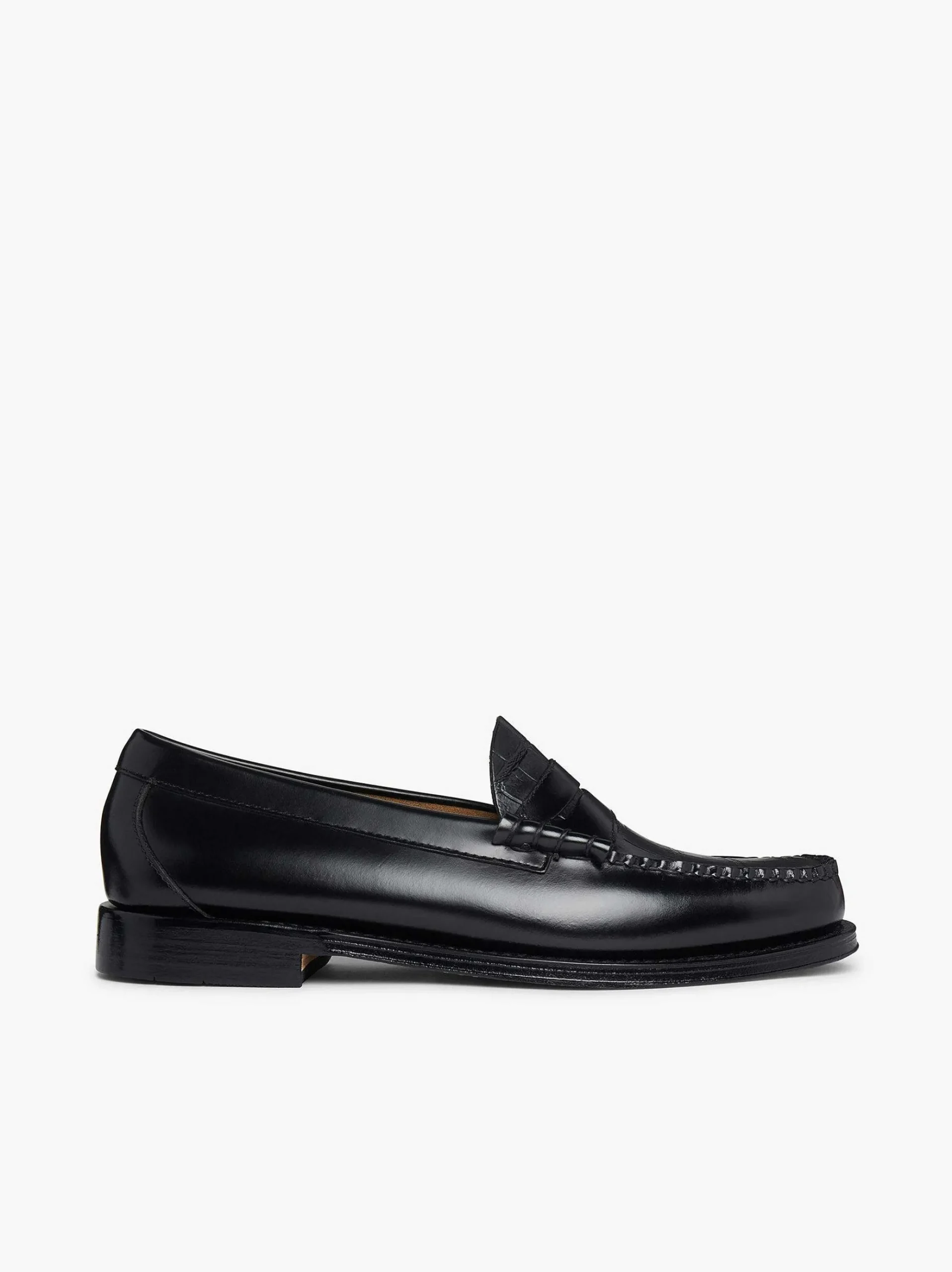 Handmade In El Salvador From Black Polished Moc Leather,The Timeless Penny Loafer Profile Is Updated With A Tactile Croc Embossed Apron For Textured Contrast And A Pop Of Intrigue. Set On The Classic Leather Sole For An Elegant Silhouette, This Style Works Well With Dressy Occasion Wear Or Brings Smartness To Tailored Office Styles.
