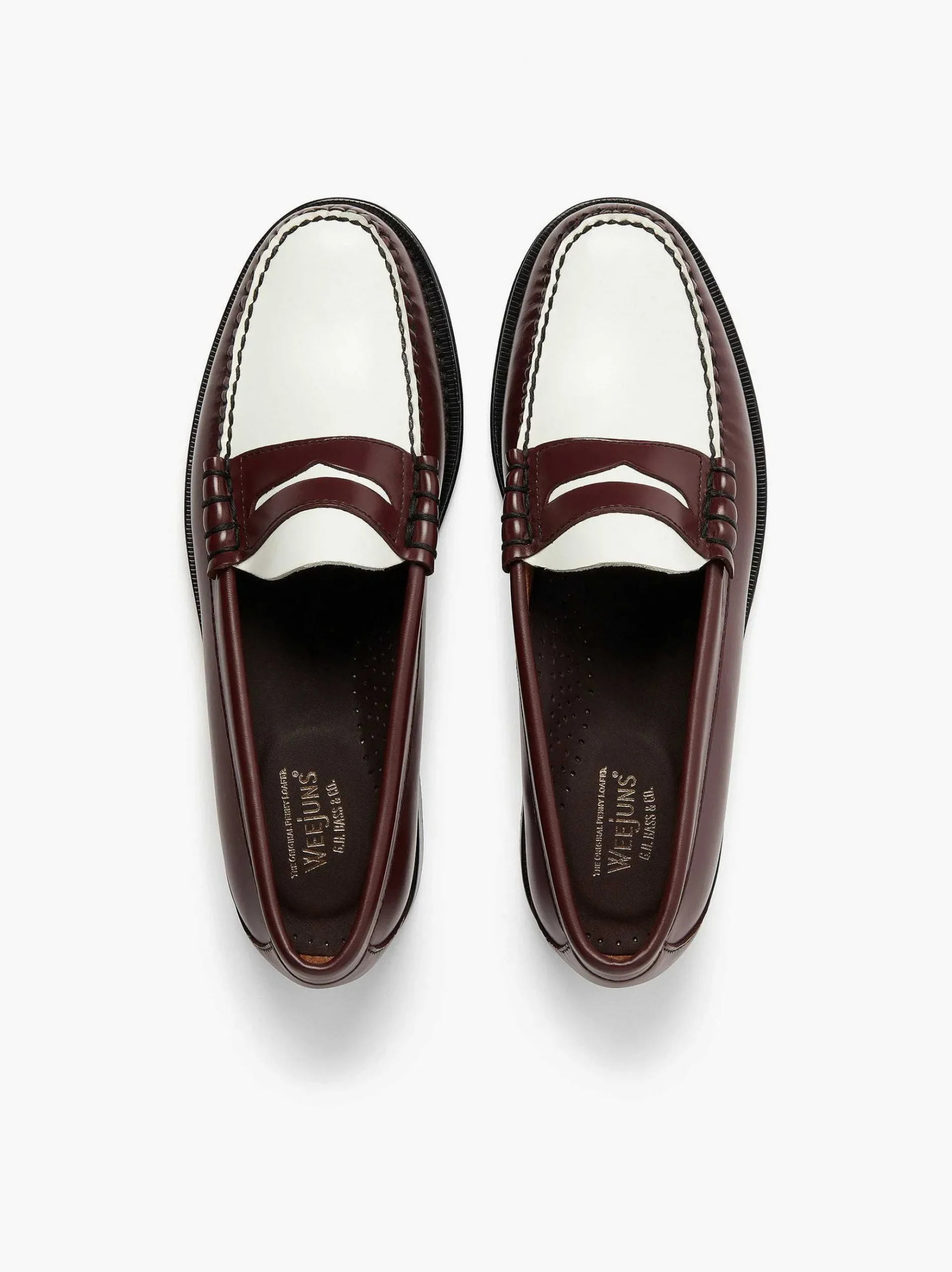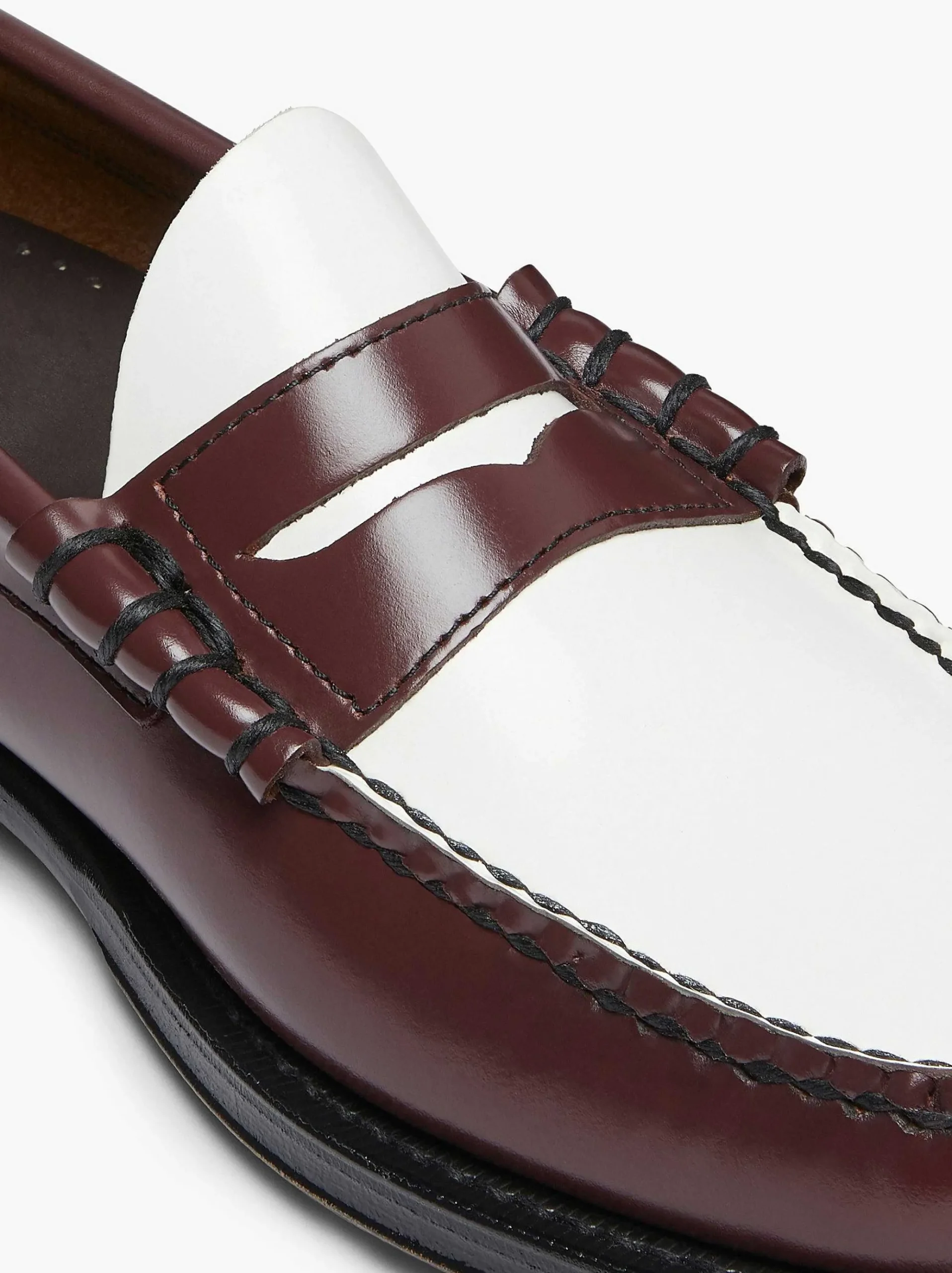 The Larson Moc Penny Is A Playful Two-Tone Style Crafted From Smooth Polished Leather In Contrast Wine And Crisp-White Shades. Set On The Classic Black Leather Outsole And Handstitched Using Heritage Construction Techniques For Time-Tested Quality And Comfort, This Bold Yet Refined Shoe Works Well With Navy Tailoring Or With Trousers That Have A Checked Patterned Finish.